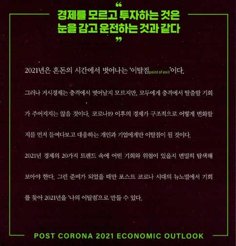 2021년은 혼돈의 시간에서 벗어나는 '이탈점(Point of Exit)'이 될 것이다. 거시경제는 충격에서 벗어나 다시 상승을 시작할 것이다. 그러나 모든 개인과 기업에게 충격에서 벗어날 기회가 주어지지는 않을 것이다. 이탈점은 혼돈에서 벗어나 다시 성장을 시작하는 지점이면서 동시에 과거의 질서에서 벗어나 새로운 질서로 나아가는 출발점이기 때문이다. 코로나19 이후의 경제가 구조적으로 어떻게 변화할지를 먼저 읽고, 그 속에서 기회를 찾아 대응하는 개인과 기업에게만 2021년은 이탈점이 될 것이다. 2021년은 거대한 변화가 본격적으로 수면 위로 모습을 드러내기 시작하는 첫해가 될 것이다.